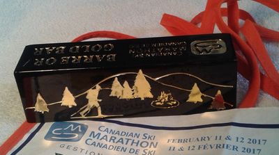 Le Marathon Canadien de Ski est une famille avec ses skieurs, bénévoles, spectateurs et organisateurs. Nous partageons les bonheurs, les douleurs, les déceptions et les joies de cet événement. Ce que nous faisons le mieux est de prendre soins les uns des autres. Si l’un d’entre nous tombe ou manque de quelque chose, les autres sont là pour lui. Ce que nous avons vécu ensemble samedi le 11 février 2017 est un tragique accident. Un membre de notre famille n’est pas rentré à la maison. Quand c’est arrivé, nous avons fait ce que nous faisons de mieux : Nous avons pris soins les uns des autres. Certains directement au lieu de l’accident, auprès de la personne qui venait de tomber. D’autres ont cherché du secours. Tous le monde était disponible pour aider. Plusieurs d’entre nous ont été touchés au plus profond d’eux-mêmes. De nouveau, nous avons pris soins les uns des autres avec des mots d’espoir et de réconfort, même des accolades. Nous avons tous perdu un petit morceau de nous-mêmes sur la piste lors de ce samedi tragique. Mes pensées les plus sincères vont vers sa famille. J’ai peint ma Barre d'Or en noir pour ne jamais oublier.